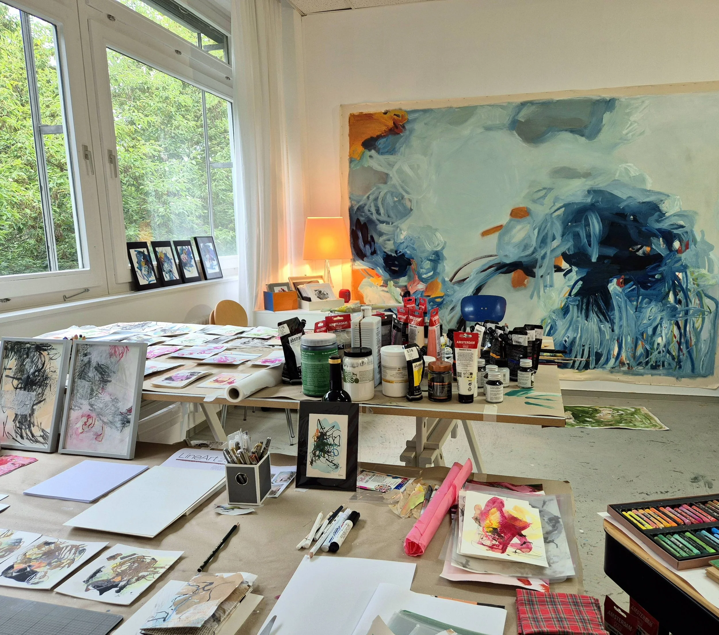 Mein Atelier ist mein persönlicher Freiraum, in dem ich ohne Einschränkungen arbeiten kann. Hier experimentiere ich und arbeite meistens an mehreren Bildern gleichzeitig. Es ist ein Ort, an dem Ideen entstehen und reifen können, und an dem ich in meinem eigenen Rhythmus arbeiten kann.