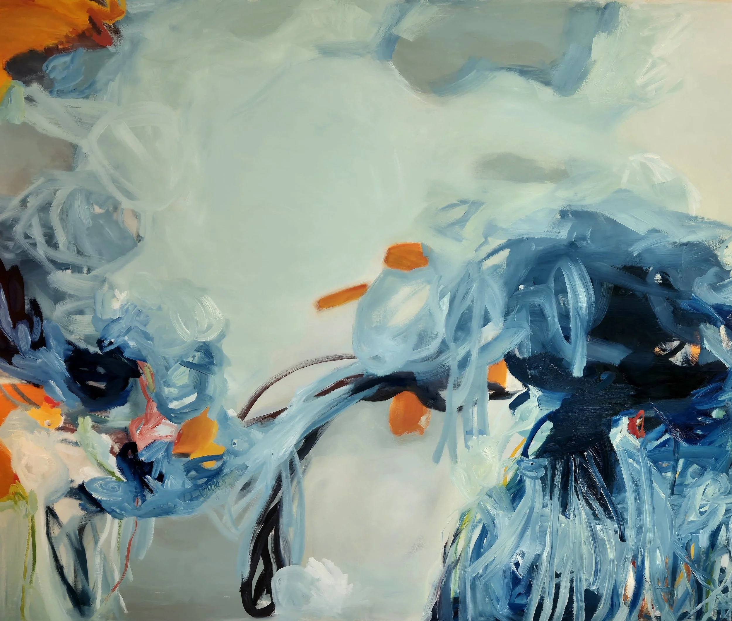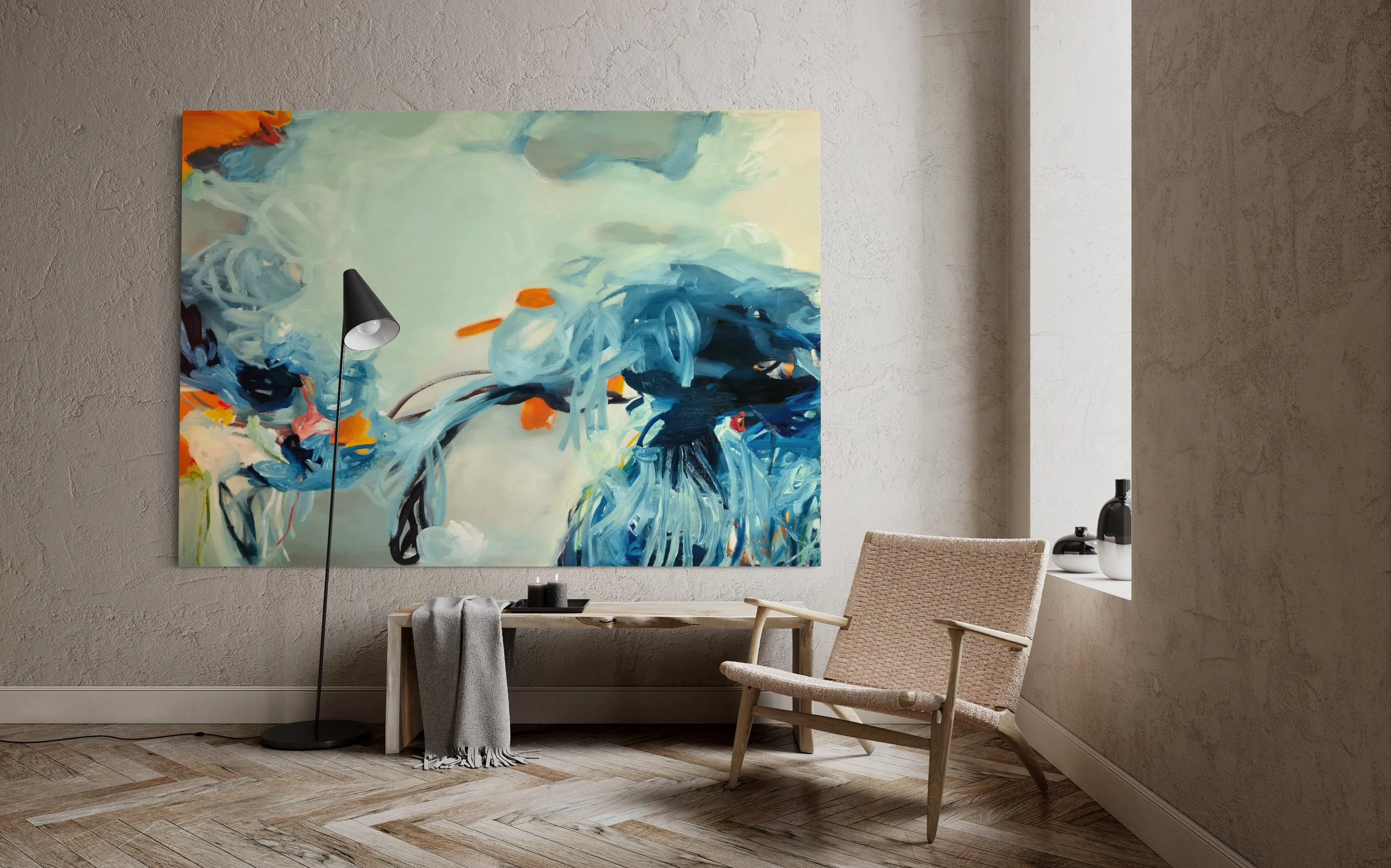Dieses großformatige abstrakte Gemälde kombiniert tiefe Blautöne mit Orange-Ocker-Akzenten und erzeugt eine moderne, kreative Atmosphäre. Das Bild wirkt perfekt in modernen Wohnräumen, Lofts oder Designbüros. Handgemalt auf hochwertiger Leinwand – rückseitig signiert.